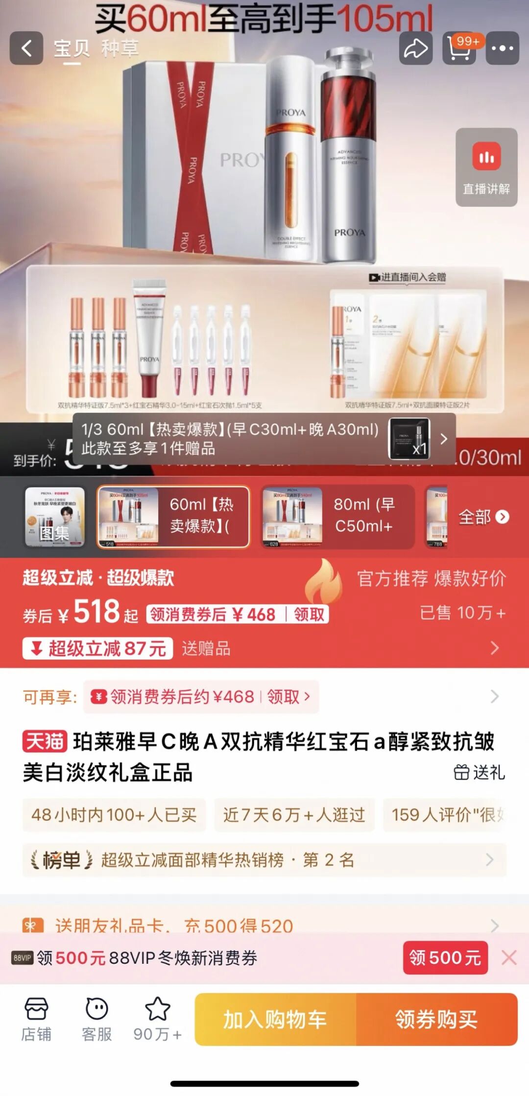 而从销量来看,倩碧302光子镭射销量3万+,只有珀莱雅早C晚A套装的三分之一。如果以单品来对比,珀莱雅双抗精华销量更是达到30万+,是倩碧的10倍。